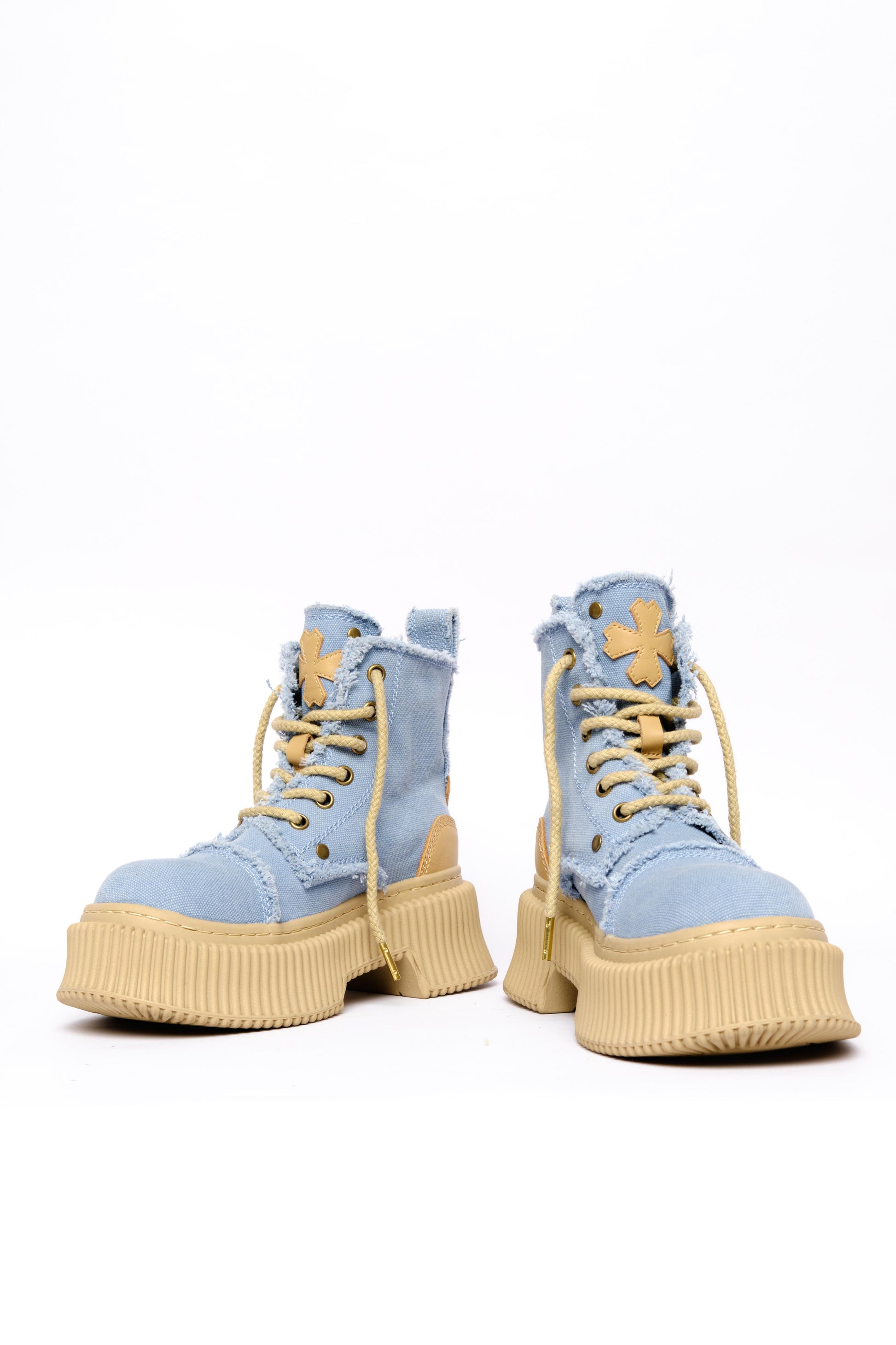 Color: Blue and BeigeMaterial: Denim and Leather